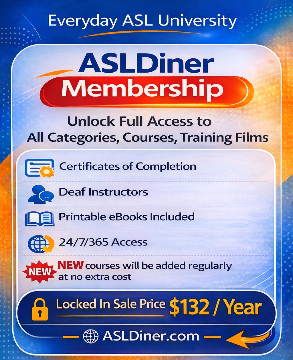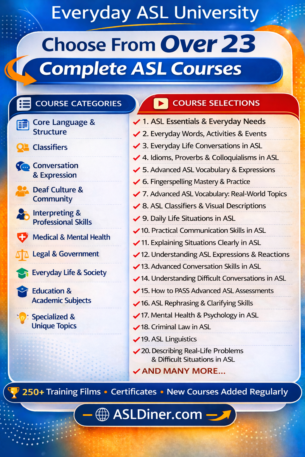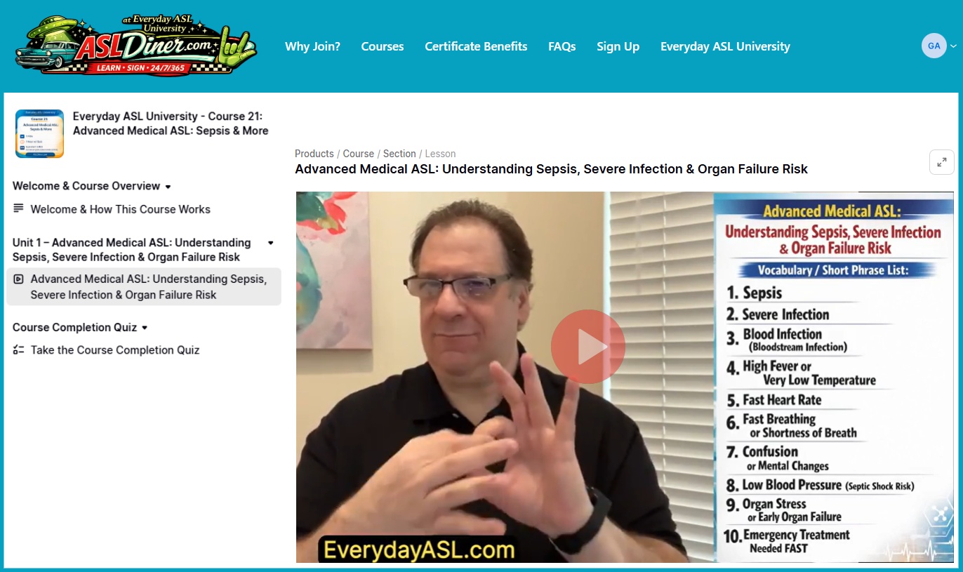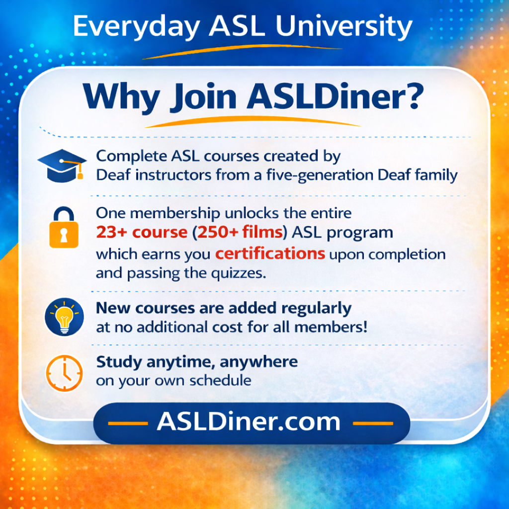 ASLDiner gives you hundreds of ASL lessons taught by Deaf ASL professors from Everyday ASL University. Learn at your own pace, build your ASL skills every day, and earn certificates as you complete each course.
