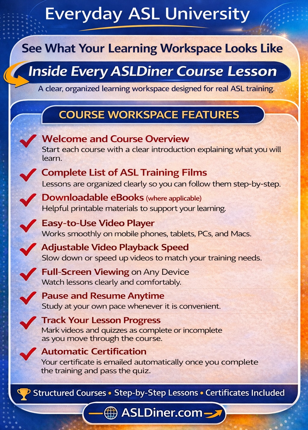 ASLDiner’s structured lesson plans guide you step-by-step through each course. With an easy-to-use video player that works across phones, tablets, laptops, PCs, Macs, TVs, and more, you can learn ASL anywhere in the world and study whenever it fits your schedule.
